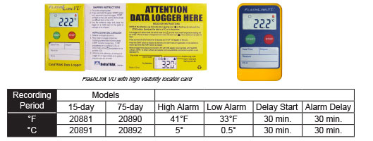 FlashLink VU 果蔬記錄儀 是專門設(shè)計(jì)用來記錄農(nóng)產(chǎn)品的貯存和運(yùn)輸溫度。記錄儀具有高/低報(bào)警設(shè)置預(yù)編程(41°F/33°F)?蛻暨\(yùn)輸農(nóng)產(chǎn)品可以使用這款一次性數(shù)據(jù)記錄儀。 它有一個(gè)大而易閱讀的液晶顯示屏,智能溫度記錄儀,能夠提供即時(shí)的溫度信息和統(tǒng)計(jì)數(shù)據(jù),包括行程中的溫度上下極限、溫度超標(biāo)的累積時(shí)間、最高溫度、最低溫度和平均溫度。即 使是使用者不啟動(dòng)數(shù)據(jù)記錄儀,其專利的影子記錄功能也能保證歷史溫度數(shù)據(jù)的獲取。 應(yīng)用:記錄溫度敏感的產(chǎn)品儲(chǔ)存和運(yùn)輸條件的理想設(shè)備。