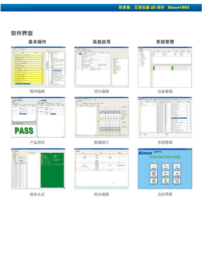 主要特點(diǎn) 1.兼容多種類型:系統(tǒng)采用艾諾自主研發(fā),,擁有自主知識(shí)產(chǎn)權(quán)的高性能儀器組成,滿足客戶多樣性產(chǎn)品測(cè)試要求,一種型號(hào)可兼容多種類型產(chǎn)品:適配器/充電器/電源板,PDP/LCD Inverter/LIPS/LED。 2.并行多路測(cè)試:系統(tǒng)采用多路并行架構(gòu)設(shè)計(jì),可同時(shí)測(cè)試4路/8路以及更多的充電器/適配器,,也可并行測(cè)試2路/4路多通道輸出的開(kāi)關(guān)電源板、背光電源板、PC電源。 3.獨(dú)有高速模式:在優(yōu)化測(cè)量測(cè)試性能和速度的基礎(chǔ)上,系統(tǒng)的通信命令可并行發(fā)送,多機(jī)同步并行處理,測(cè)試速度更快。 4.數(shù)據(jù)一致穩(wěn)定:系統(tǒng)采用艾諾高精度儀器,并通過(guò)嚴(yán)格的一致性、穩(wěn)定性測(cè)試,保障本機(jī)測(cè)試數(shù)據(jù)的穩(wěn)定性以及多機(jī)之間的一致性。 5.易學(xué)習(xí)易使用:系統(tǒng)所使用的工裝在考慮信號(hào)穩(wěn)定性的同時(shí)兼顧人性化操作;測(cè)試軟件在擁有強(qiáng)大的項(xiàng)目編輯、報(bào)表編輯、命令編輯的同時(shí)兼顧國(guó)人學(xué)習(xí)操作習(xí)慣,,中英文顯示;