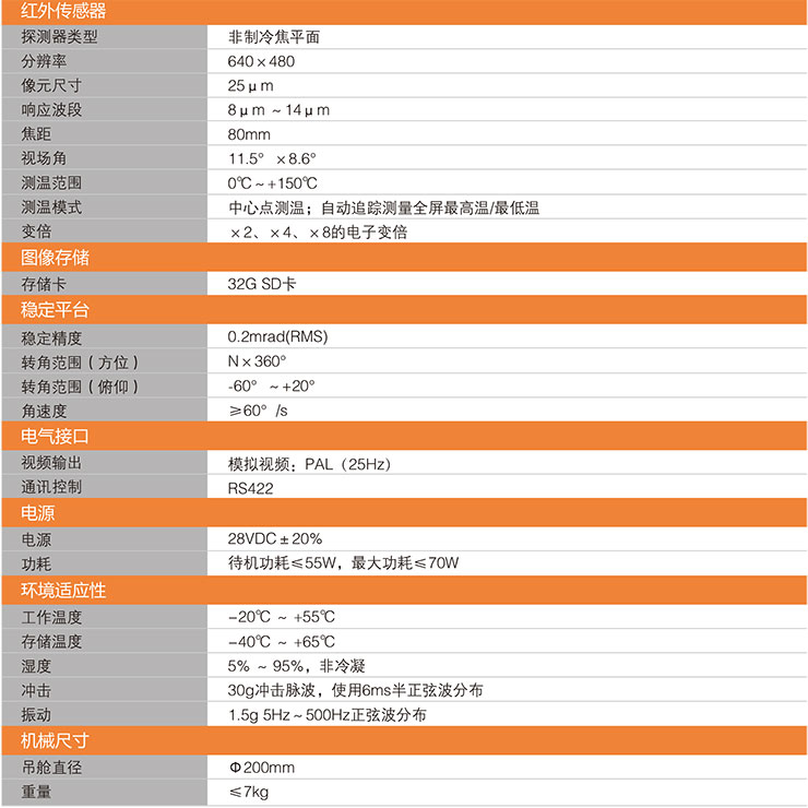 產(chǎn)品特點 體積小重量輕 直徑200mm,紅外熱成像儀價格,重量7kg,大大降低飛機有效負荷 640x480高分辨率紅外熱成像儀 分辨率高,可清晰分辨出輸電線路發(fā)熱故障點 跟蹤精度高穩(wěn)定性好 采用陀螺穩(wěn)定平臺,意大利紅外熱像儀,可有效隔離運動載體的各種振動、起伏、 顛簸,醫(yī)學紅外熱像儀,消除圖像的模糊和晃動 視頻實時回傳 高空視頻可實時回傳至地面指揮中心,紅外熱像儀成像,提高巡線效率 可拍照錄像 配置32G內(nèi)存卡,車載紅外熱像儀,可對觀測點拍照錄像,夜視紅外熱像儀,便于地面對故障進行分析 提供標準的通訊接口 標準的通訊接口,方便與無人機、直升機等載體通訊,手持式紅外熱像儀,安裝調試方便